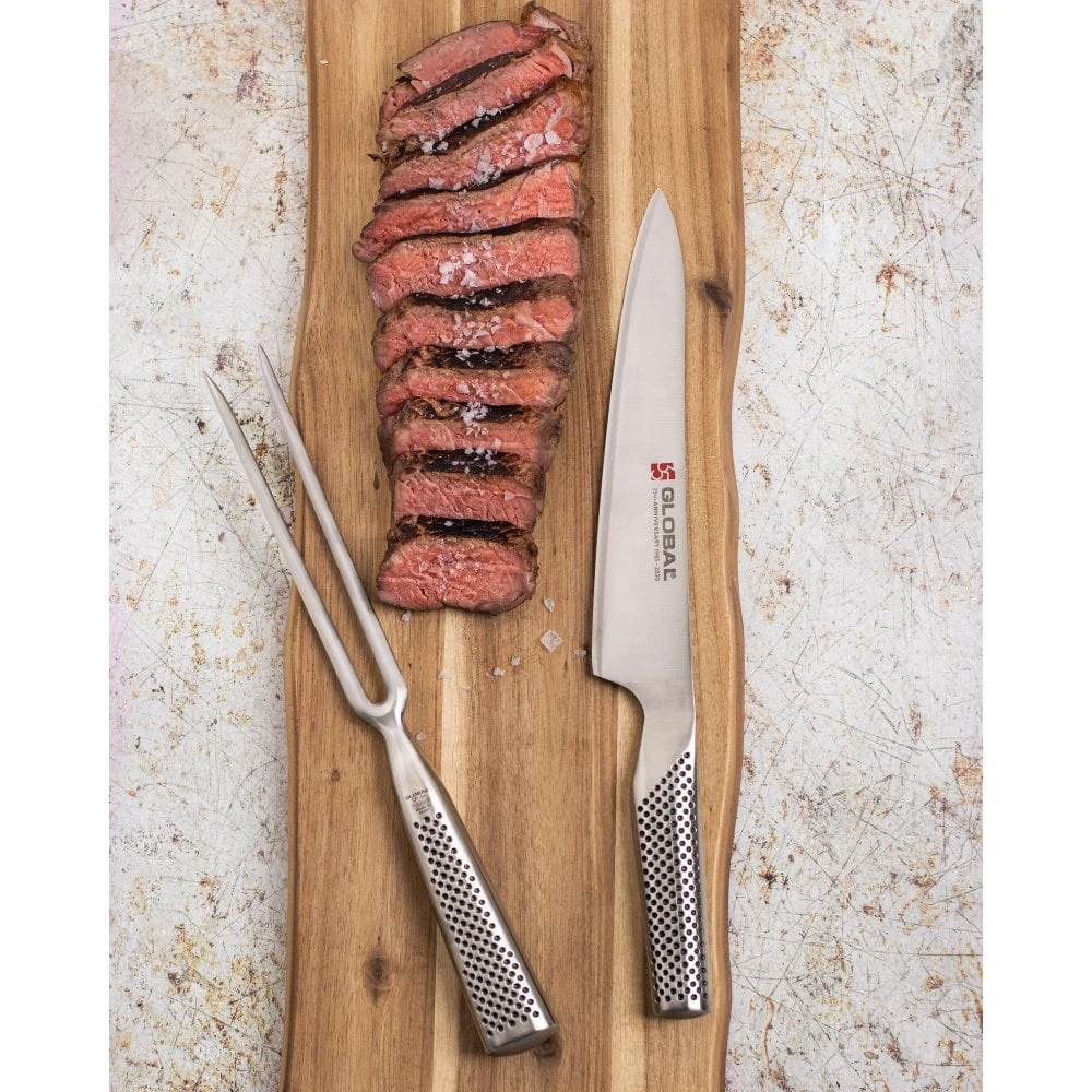 Global provide two carving forks in their range, the GF-24 and the G-13. Aesthetically the GF-24 is quite pleasing to look at. Smooth rounded lines finishing in two sharp points. I have always preferred the GF-24 to the standard G-13 carving fork. The main advantage of the GF-24 is that it fits in a drawer more easily as it lies flat! The G-13 prongs stick up meaning it often catches the roof of the drawer.