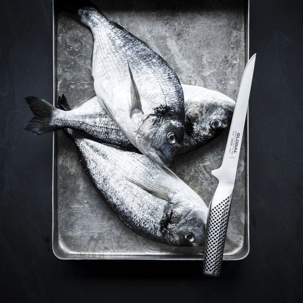 The G-21 is a classically shaped boning knife and is considered to be the standard boning knife in the Global series, it is certainly the best selling Boning knife.. The knife has a long narrow blade with is tapered to a very fine point. This allows the user to work round the bones in joints of beef, lamp or pork and cut out a sizable piece of meat. The blade is also flexible, which is great for getting under the skin and filleting fish. There are quite a few boning and filleting knives in the Global range, but the G-21 has a bolster, this is useful where working with raw meat or fish can make the knife slippy, it helps to prevent any unfortunate accidents. There is also a fully forged version of the knife, the GF-31.