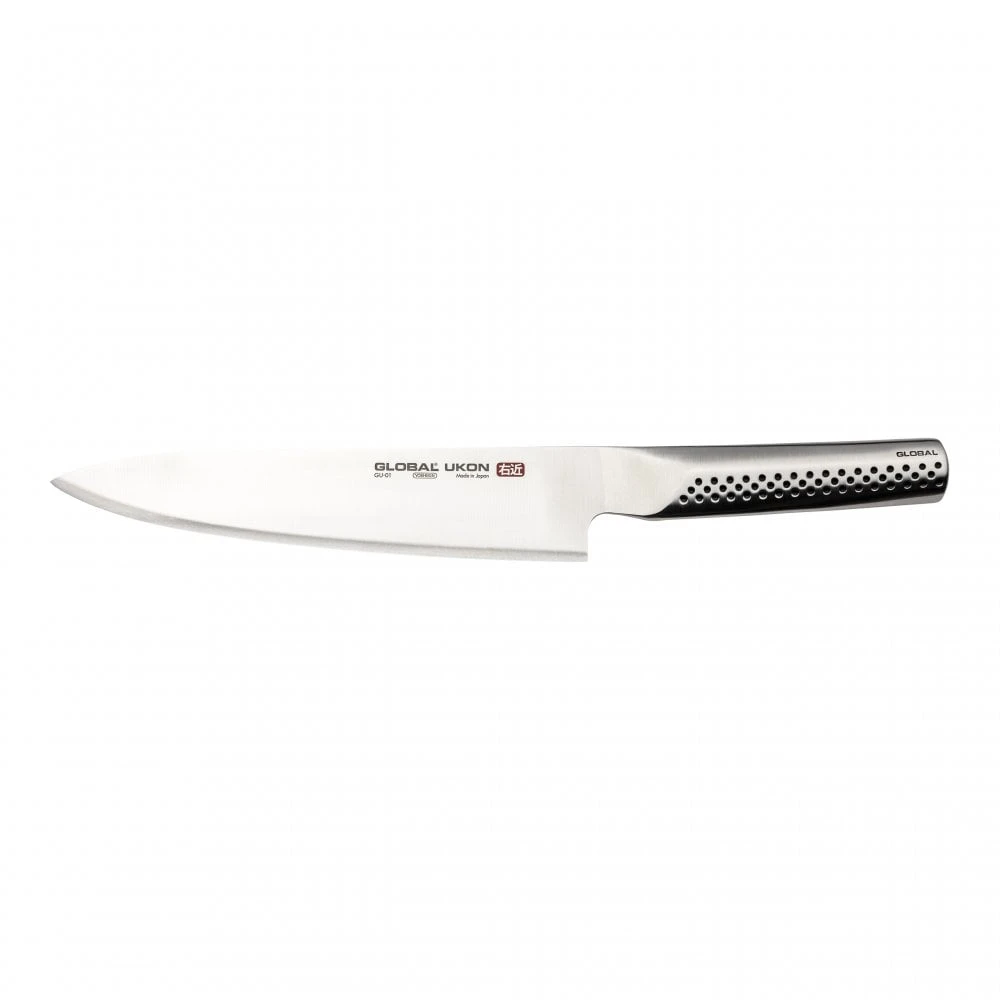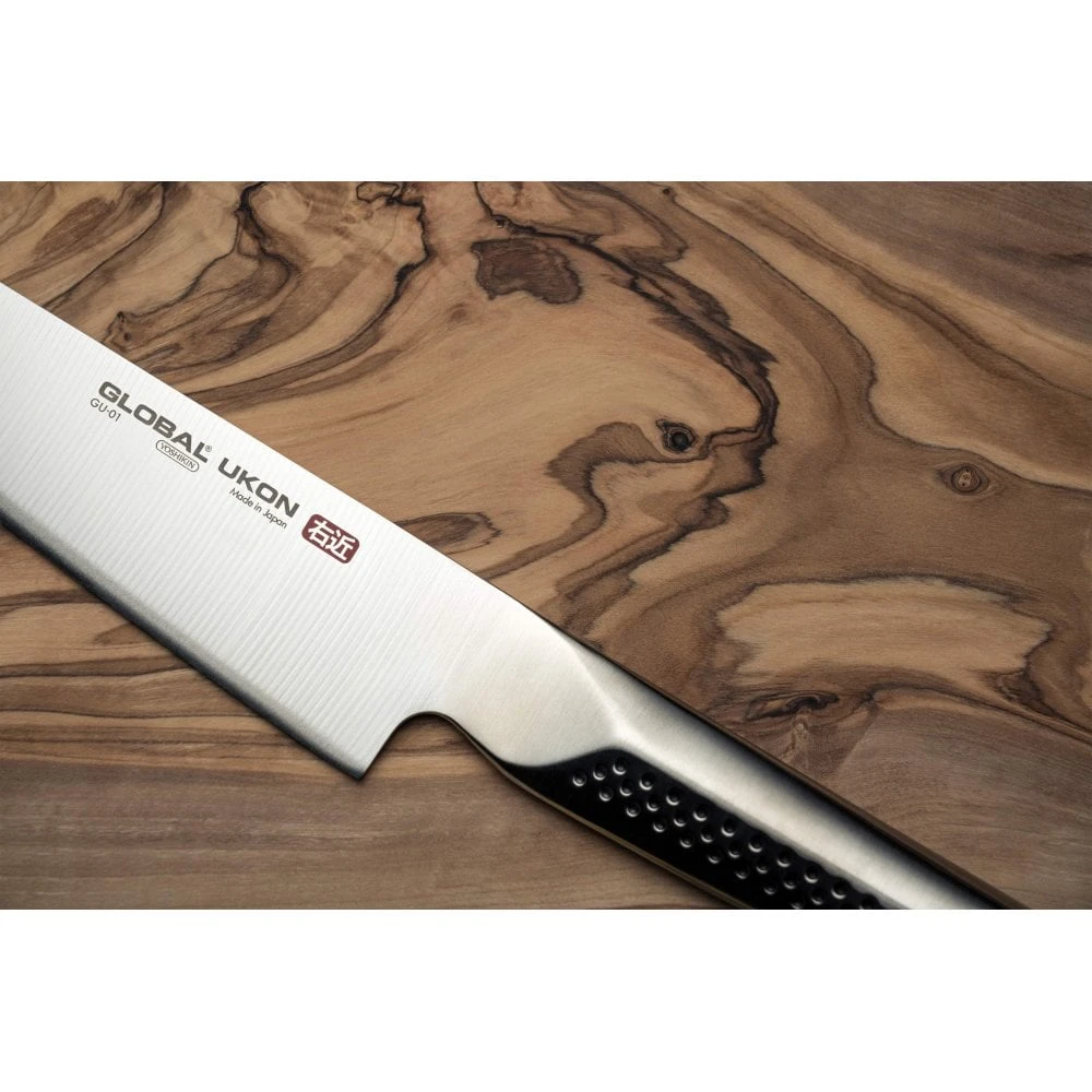 The Global Ukon GU-01 Chef’s Knife is a versatile all-purpose blade that excels at every cutting task you can think of in the kitchen. The GU-01 is great for chopping vegetables, meat and fish, and it can also be used to finely chop herbs or peel garlic. Whatever the task, slicing, dicing, chopping or mincing, you can rely on this chef’ knife to perform every time.