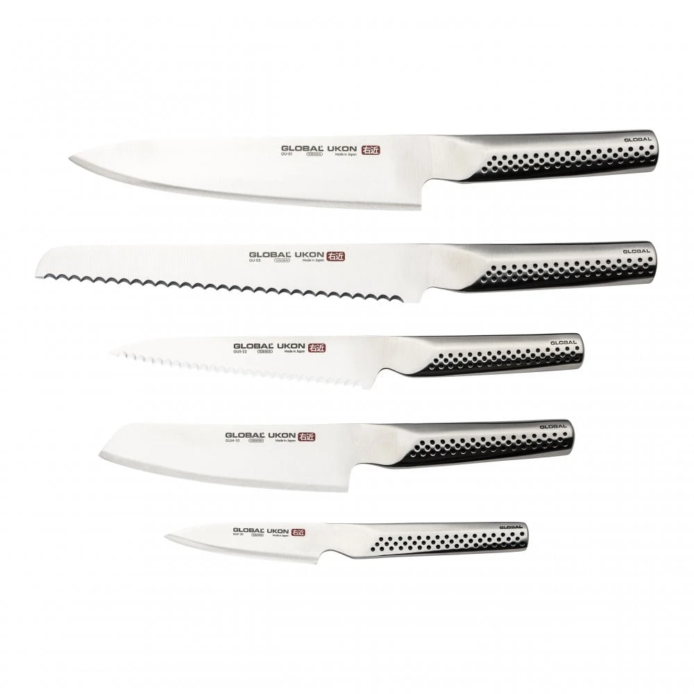 The Ukon 6-Piece Knife Block Set is a real showpiece! It features a stylish and contemporary stainless-steel and black design that will complement any kitchen setting. The knife block includes the GU-01 20cm Chef’s Knife, the GU-03 22cm Bread Knife, the GUM-10 14cm Vegetable Knife, the GUS-22 15cm Scalloped Utility Knife and the GUF-30 9cm Paring Knife.