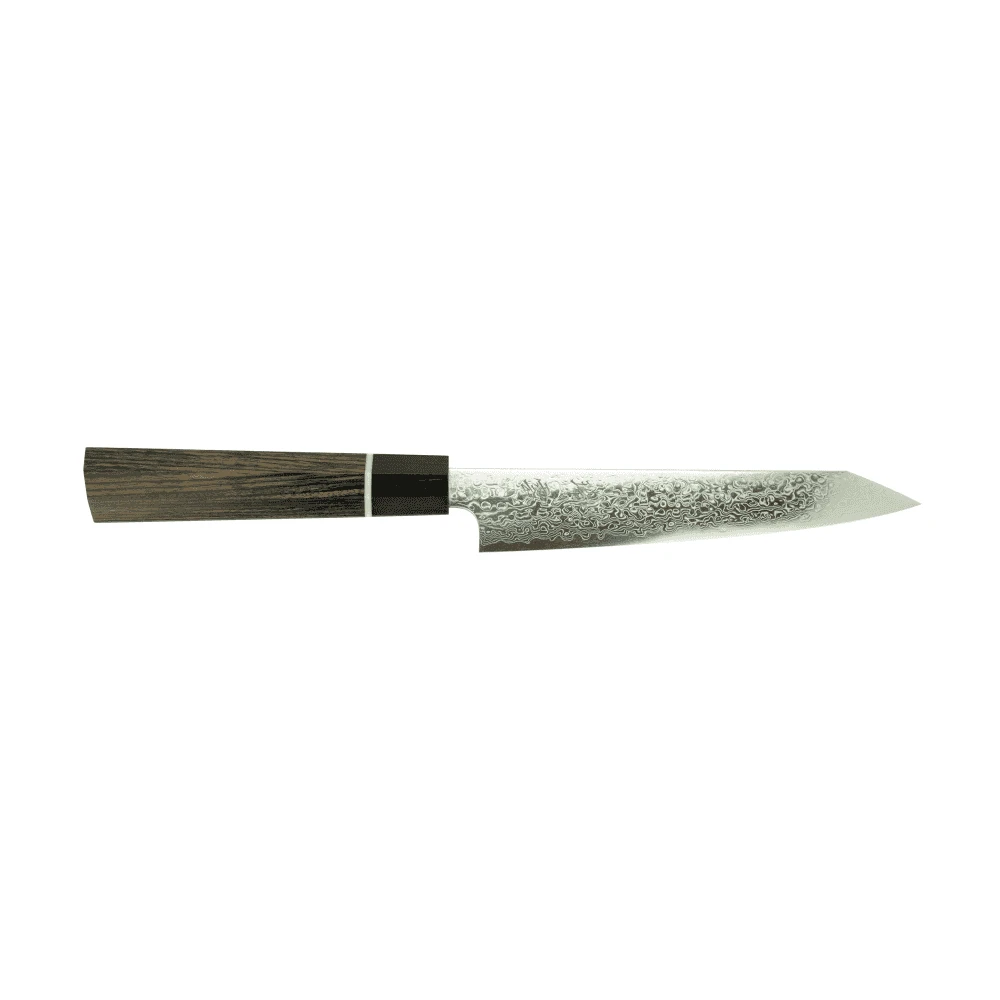 The knife’s elegant tapering design enhances its edge geometry, while the robust SG2 steel allows for remarkable thinness behind the edge, delivering exceptional cutting performance. Complementing its excellence, the knife boasts a unique Shichikaku (Heptagon) handle made of rich brown pakkawood, adorned with a captivating mosaic pin for added decorative flair.